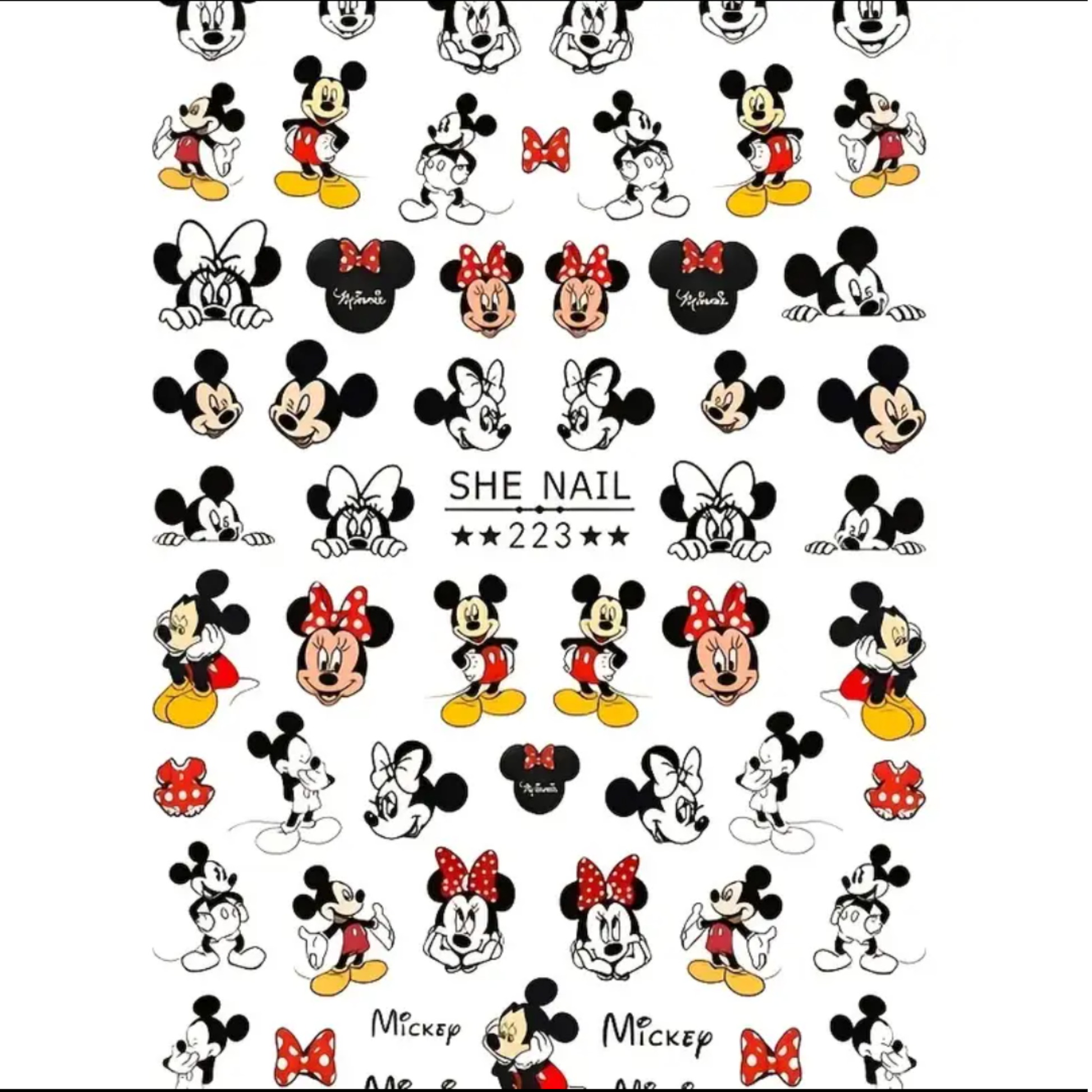 Add a dose of cuteness to your nails with the N3-SHE NAIL 223 3D Cartoon Nail Stickers. This sheet includes a full cast of iconic characters inspired by Mickey and Minnie Mouse in fun poses and outfits – ideal for creating playful, joyful nail designs.