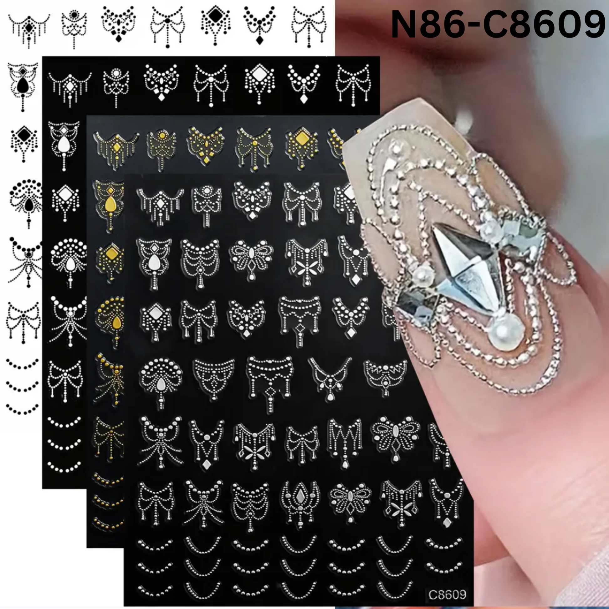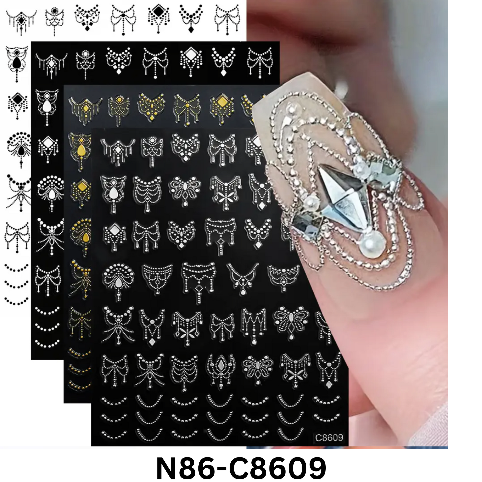 3D Chain Nail Art Stickers – Black, White, Gold, Silver Jewelry Design