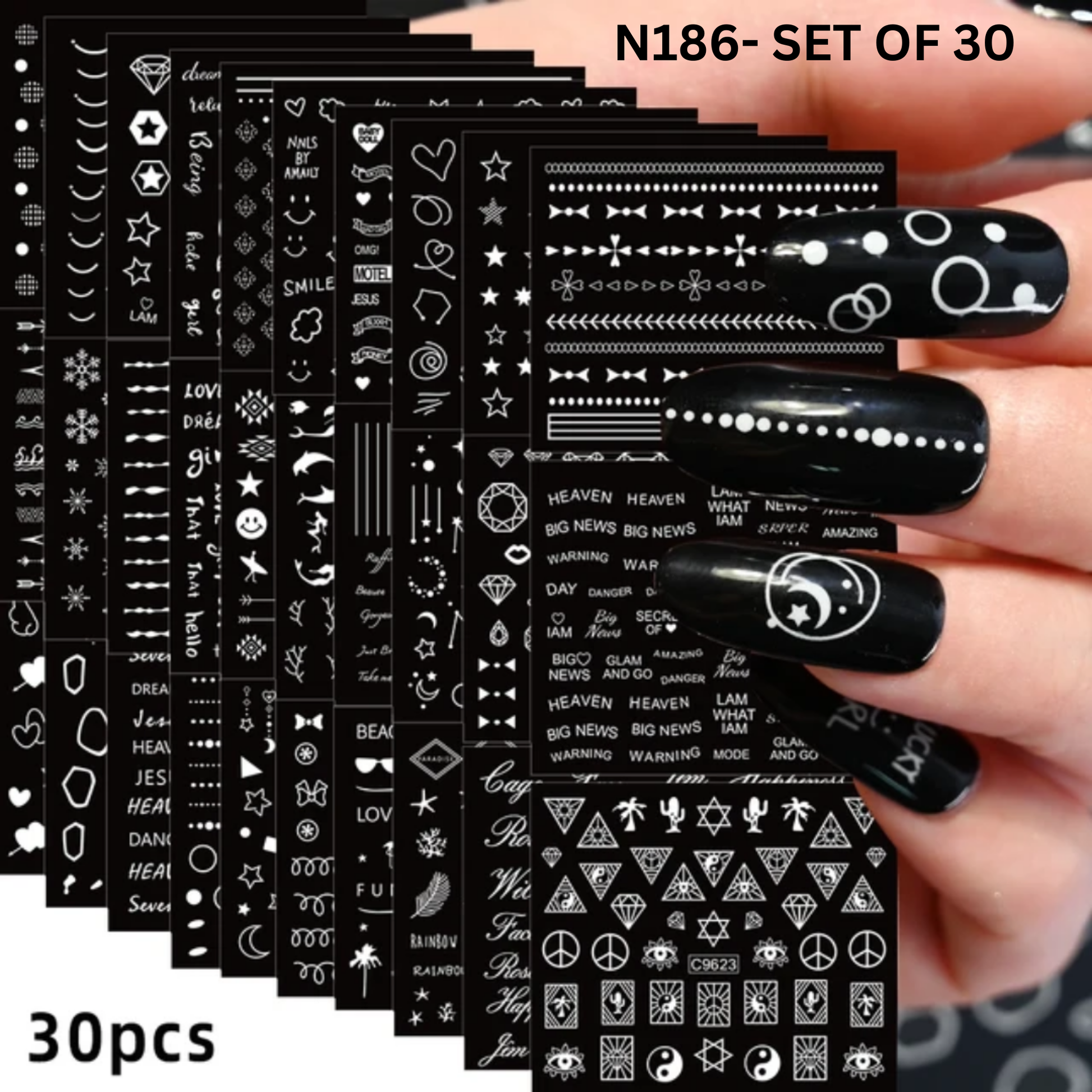 ✨ Set of 30 3D Nail Art Stickers – Gold, Silver, Black & White Options (N186)