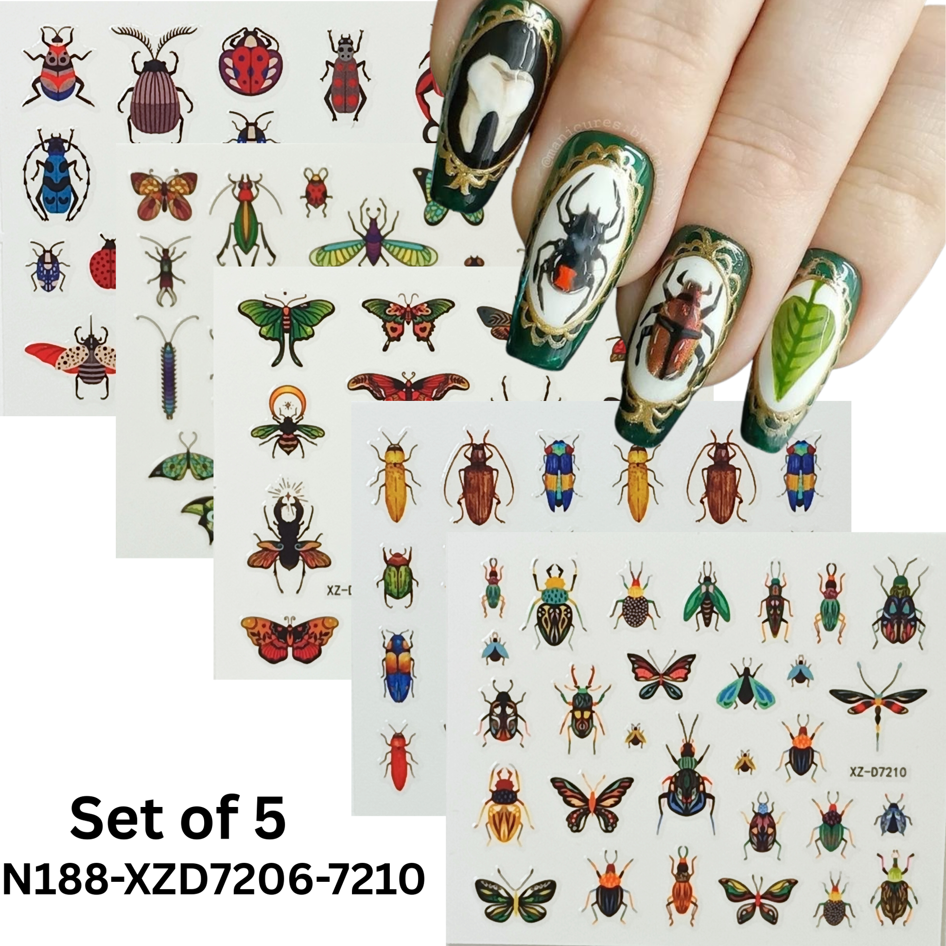 5 sheets of 3D colorful insect & butterfly nail decals (assorted designs)