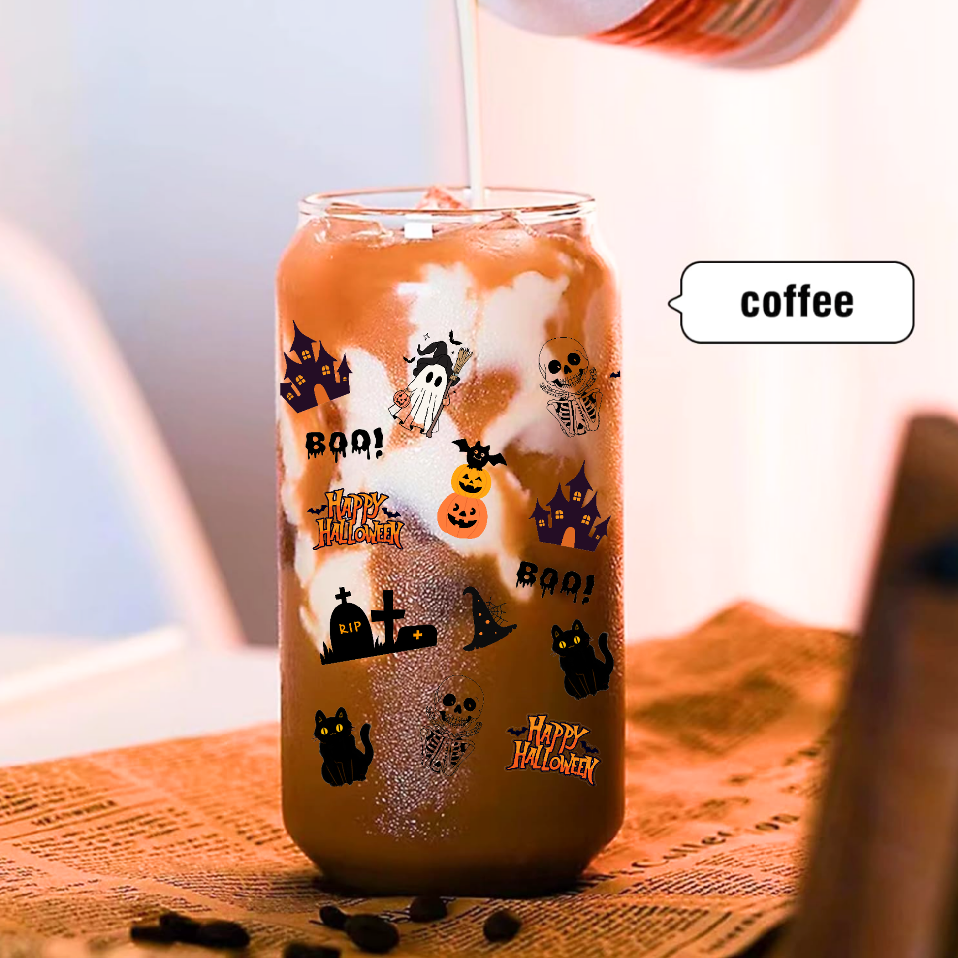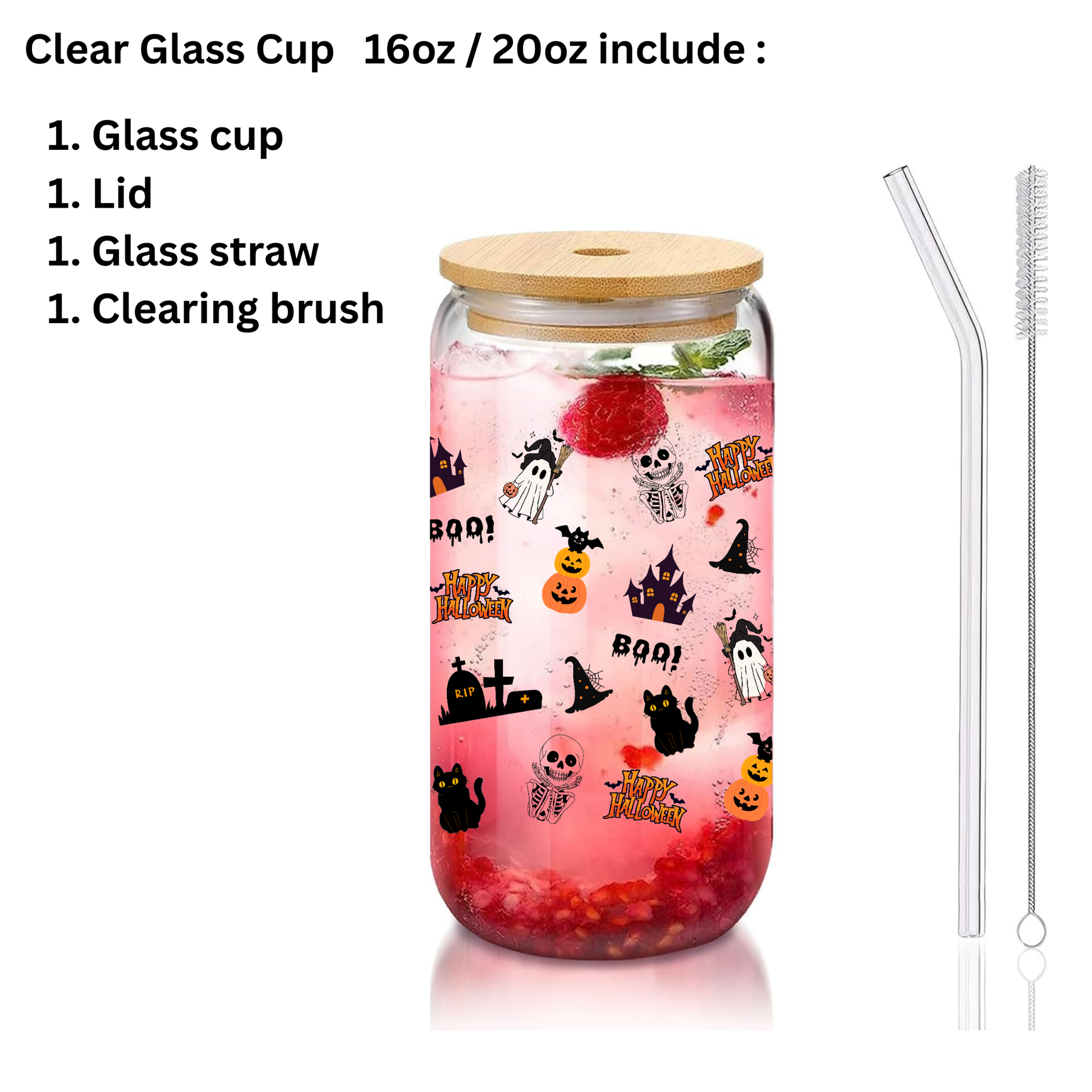 Enjoy your favorite drinks with a fun Halloween twist! This clear glass tumbler features adorable ghost, pumpkin, witch hat, and black cat designs, perfect for iced coffee, tea, smoothies, or festive cocktails.
