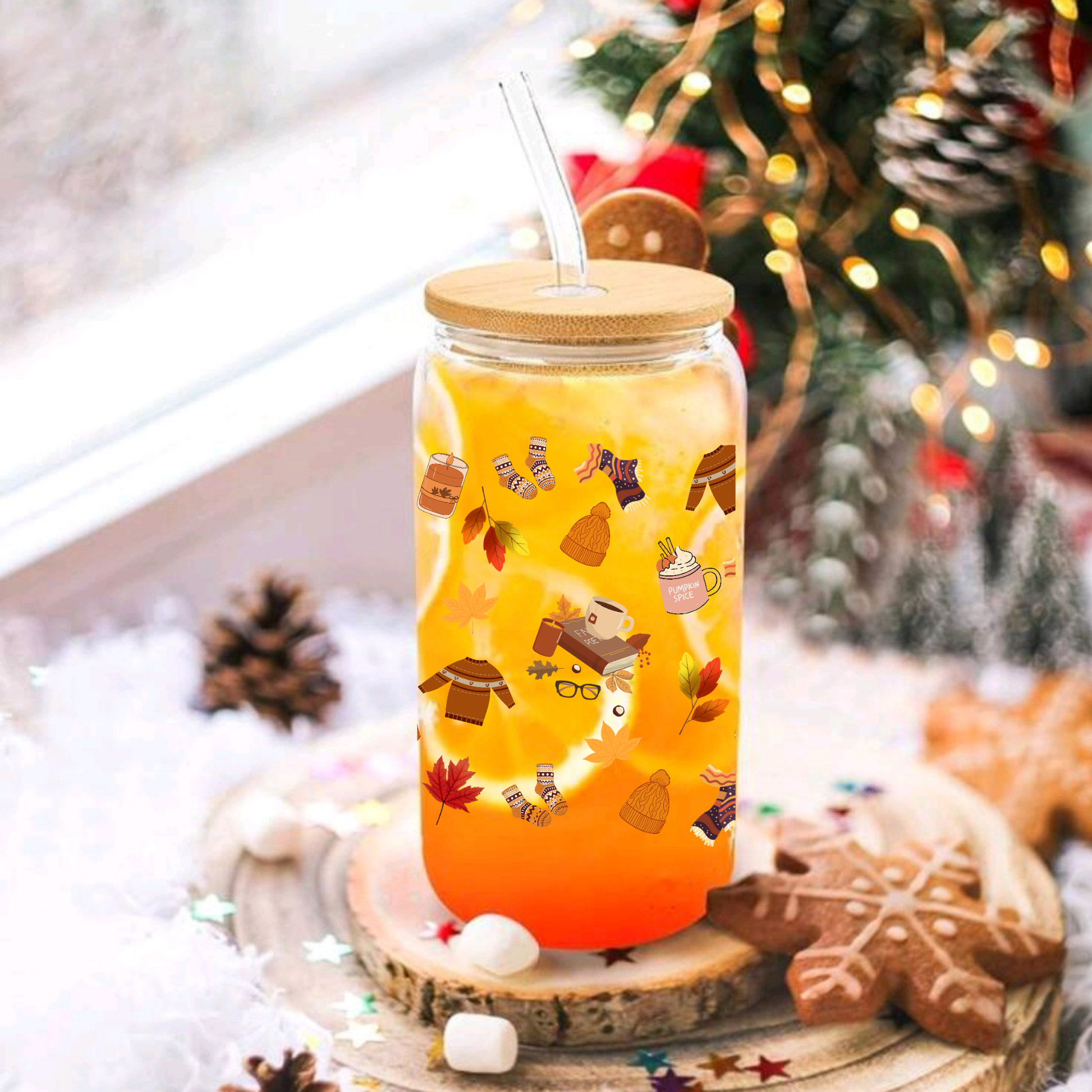 Enjoy your favorite drinks in style with this Clear Glass Can Cup Set featuring a cozy autumn design! Perfect for iced coffee, tea, smoothies, or any cold beverage, this set comes complete with everything you need for everyday use or gifting.