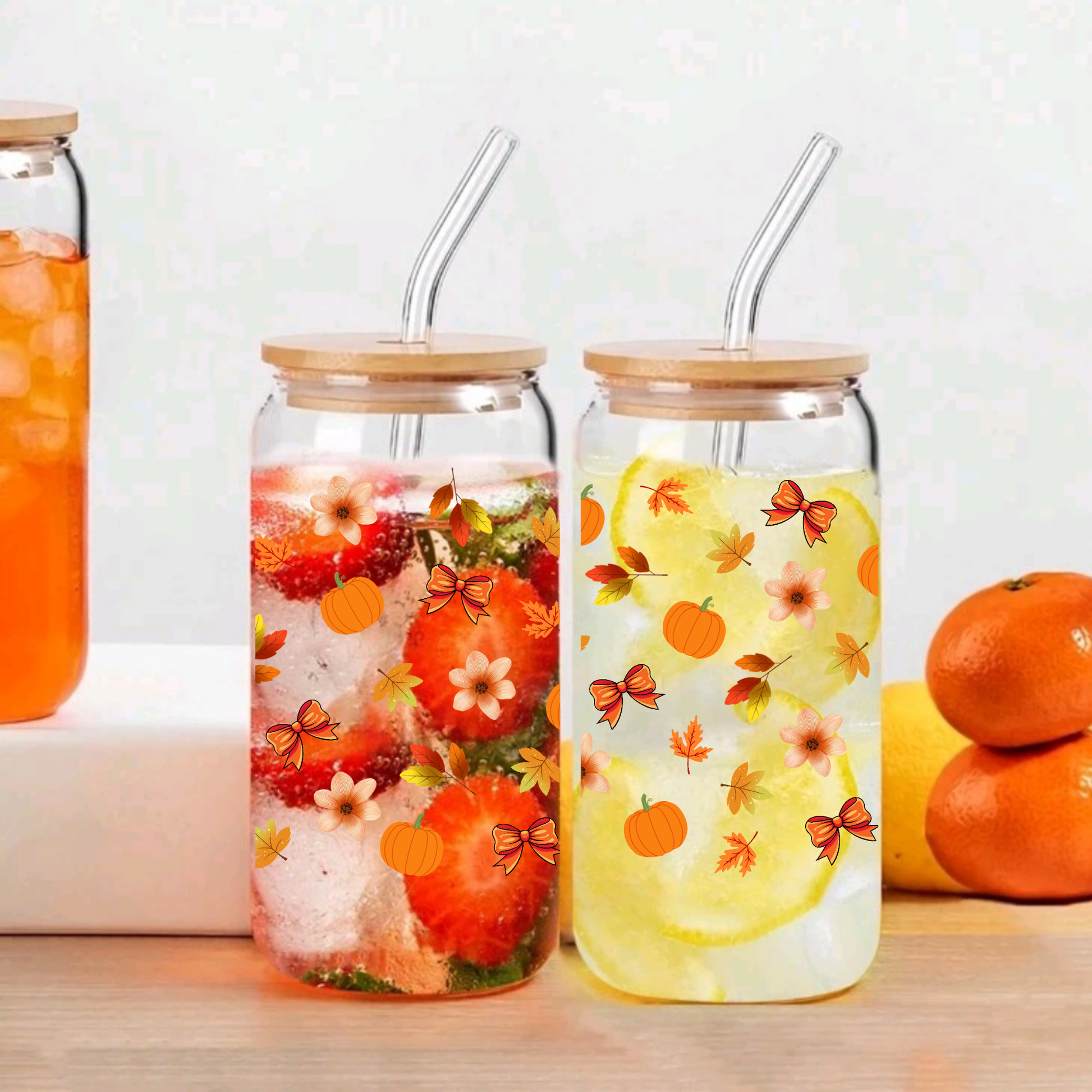 Sip your favorite drinks in cozy autumn style with this Pumpkin Clear Glass Can Cup Set! Decorated with pumpkins, fall leaves, bows, and flowers, itβs perfect for Halloween parties, fall gatherings, or everyday iced coffee and tea.