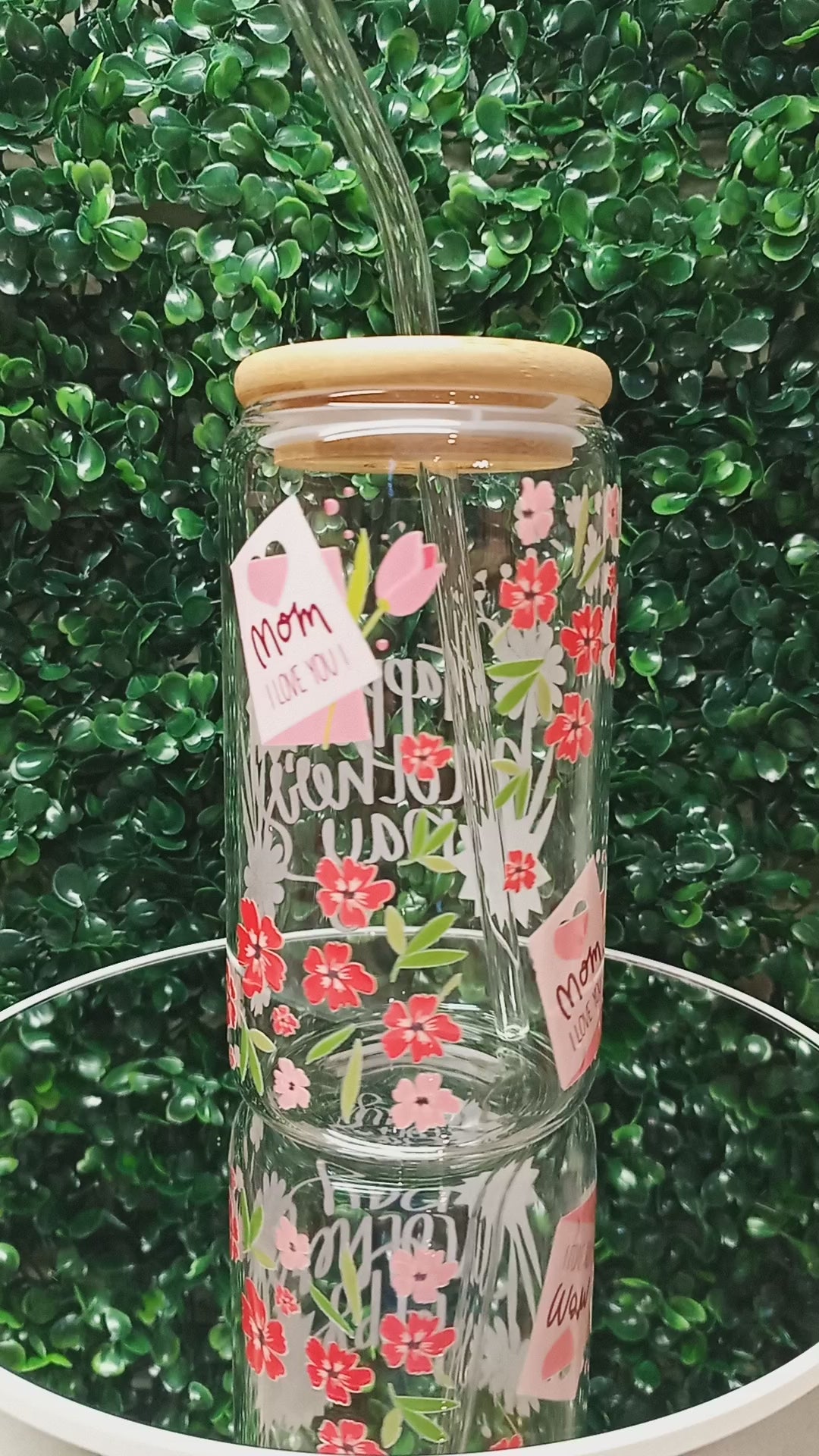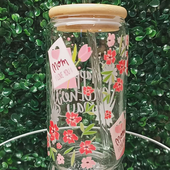 Happy Mother's day with Flowers Personalized Glass Cup 16oz & 20oz Gift For Mother's Day, Birthday,Tea, Coffee, Smoothie Glass cup