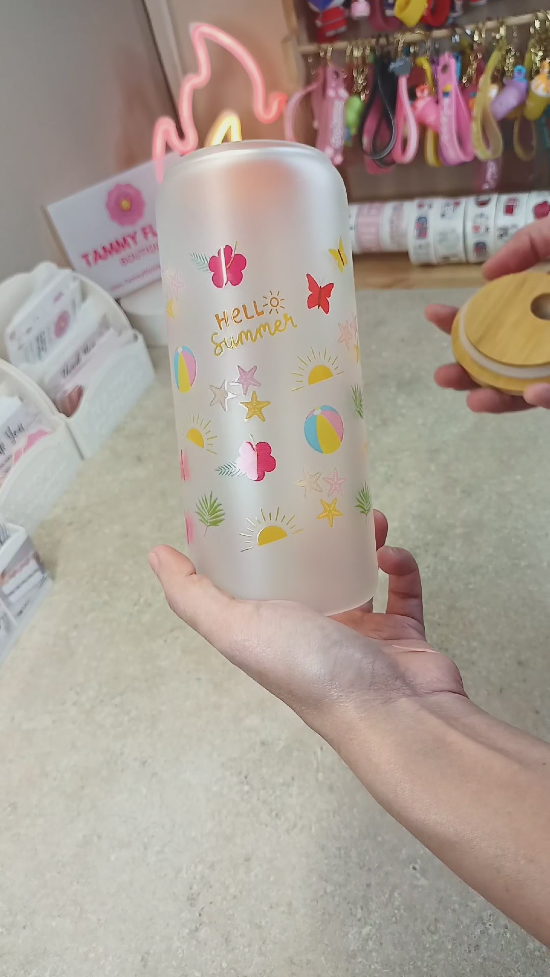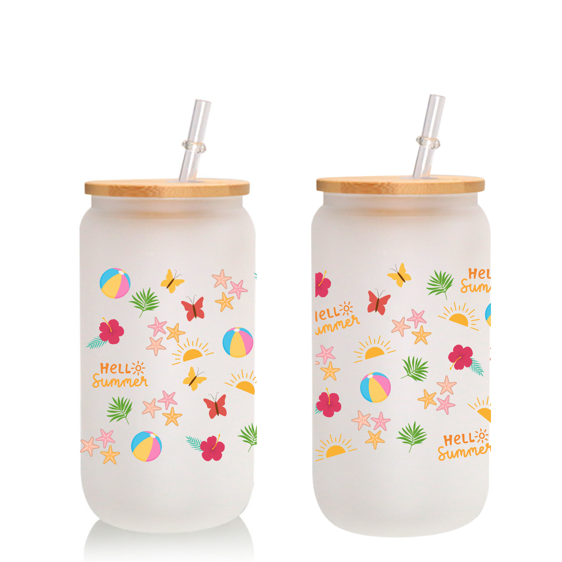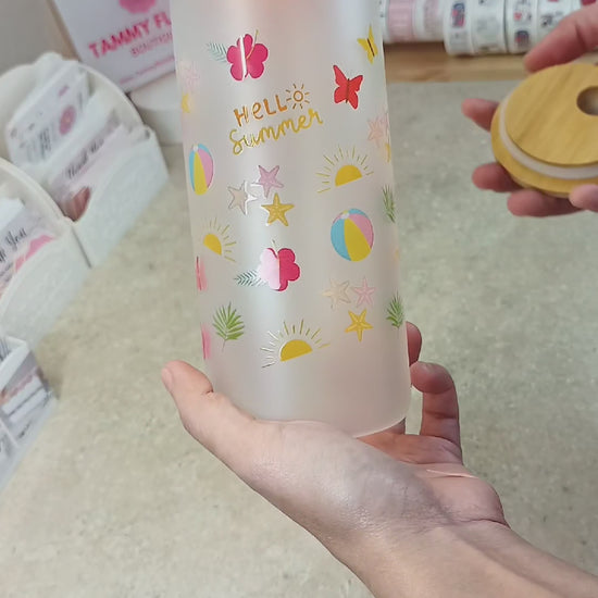 Celebrate sunshine and good vibes with our vibrant Hello Summer Frosted Glass Cup! Featuring playful summer icons like butterflies, beach balls, flowers, palm leaves, and the phrase "Hello Summer" β this cup is perfect for all your favorite cold drinks.
