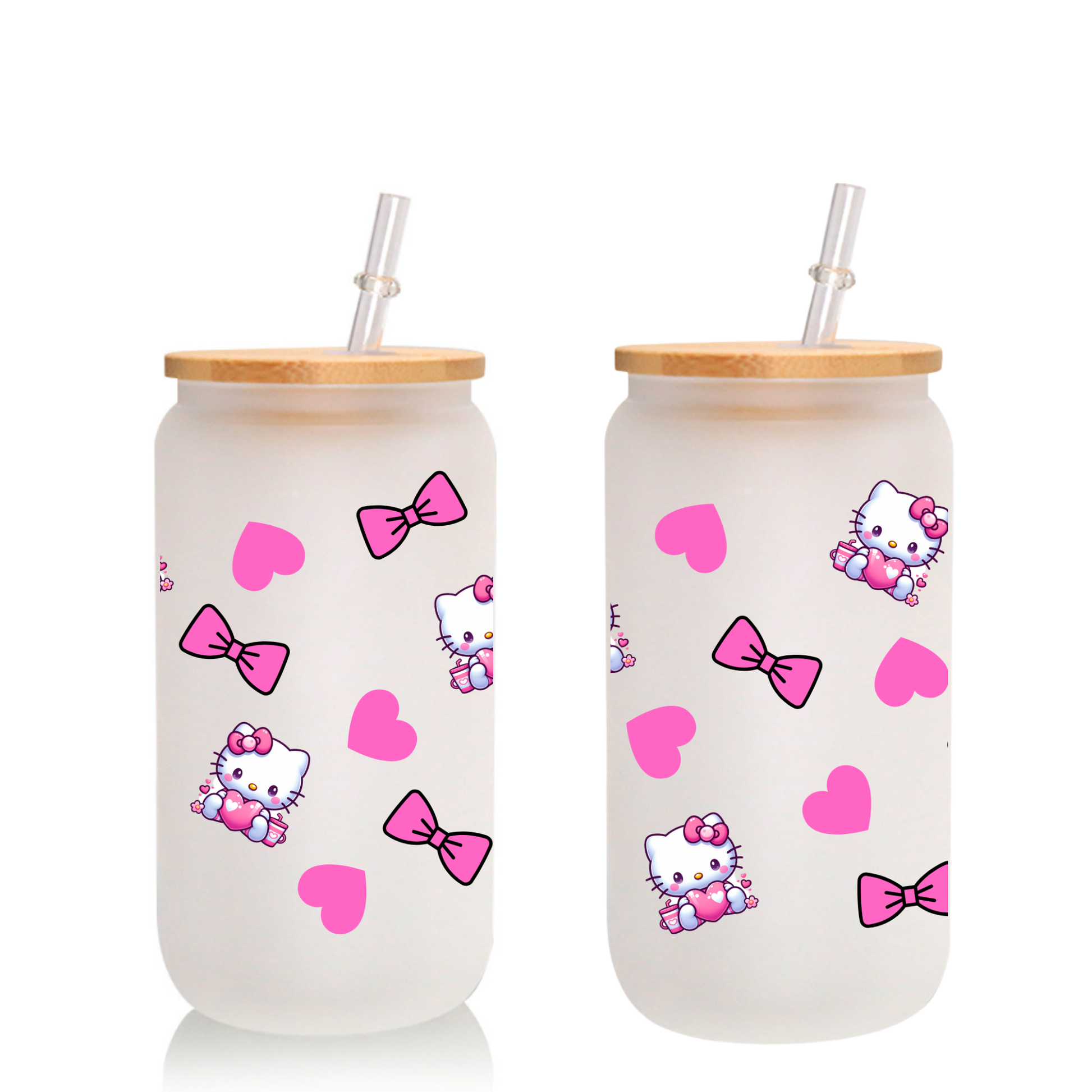 ๐ Kitty & Heart Frosted Glass Cup โ 16oz / 20oz โ With Bamboo Lid & Glass Straw