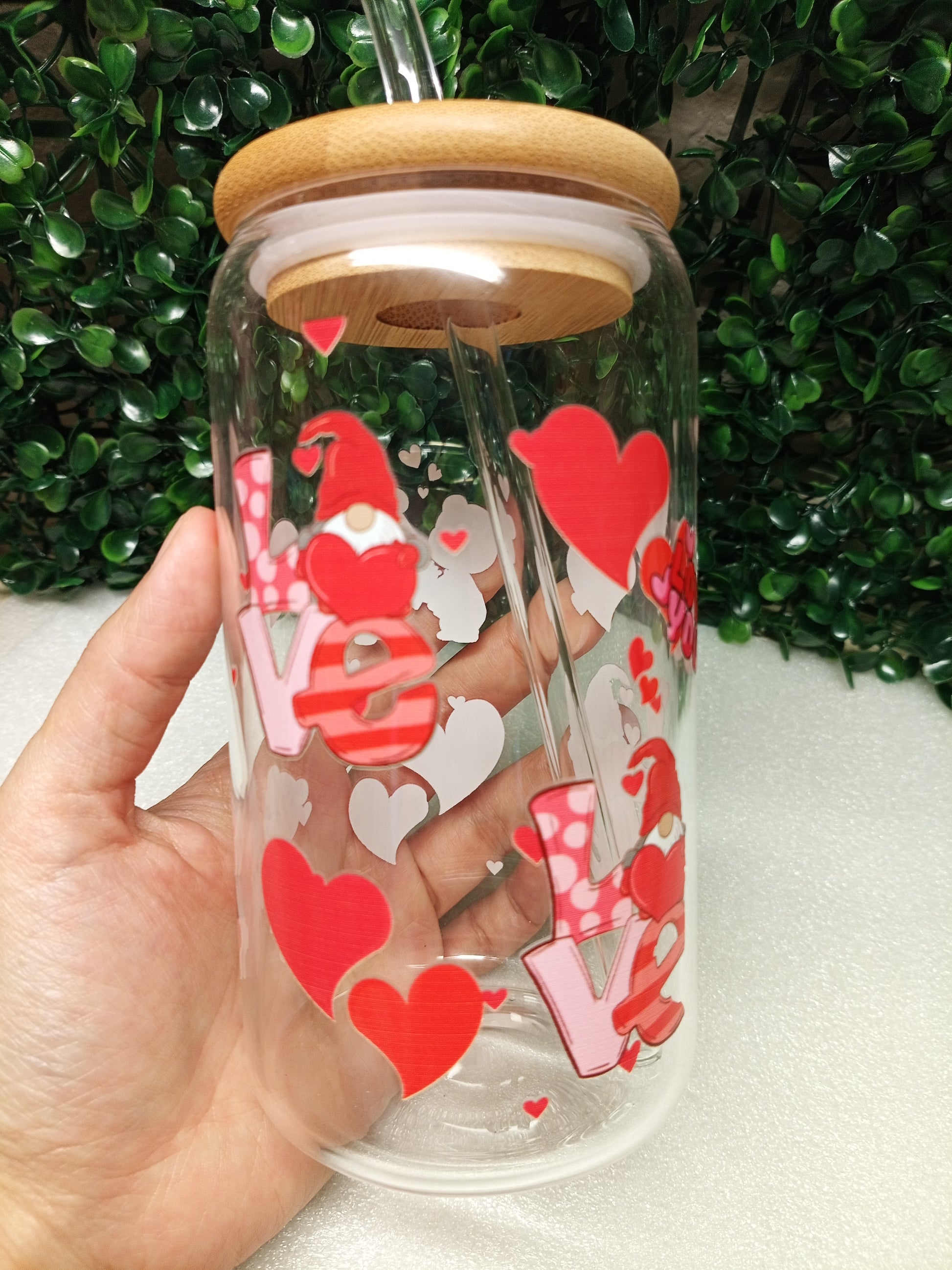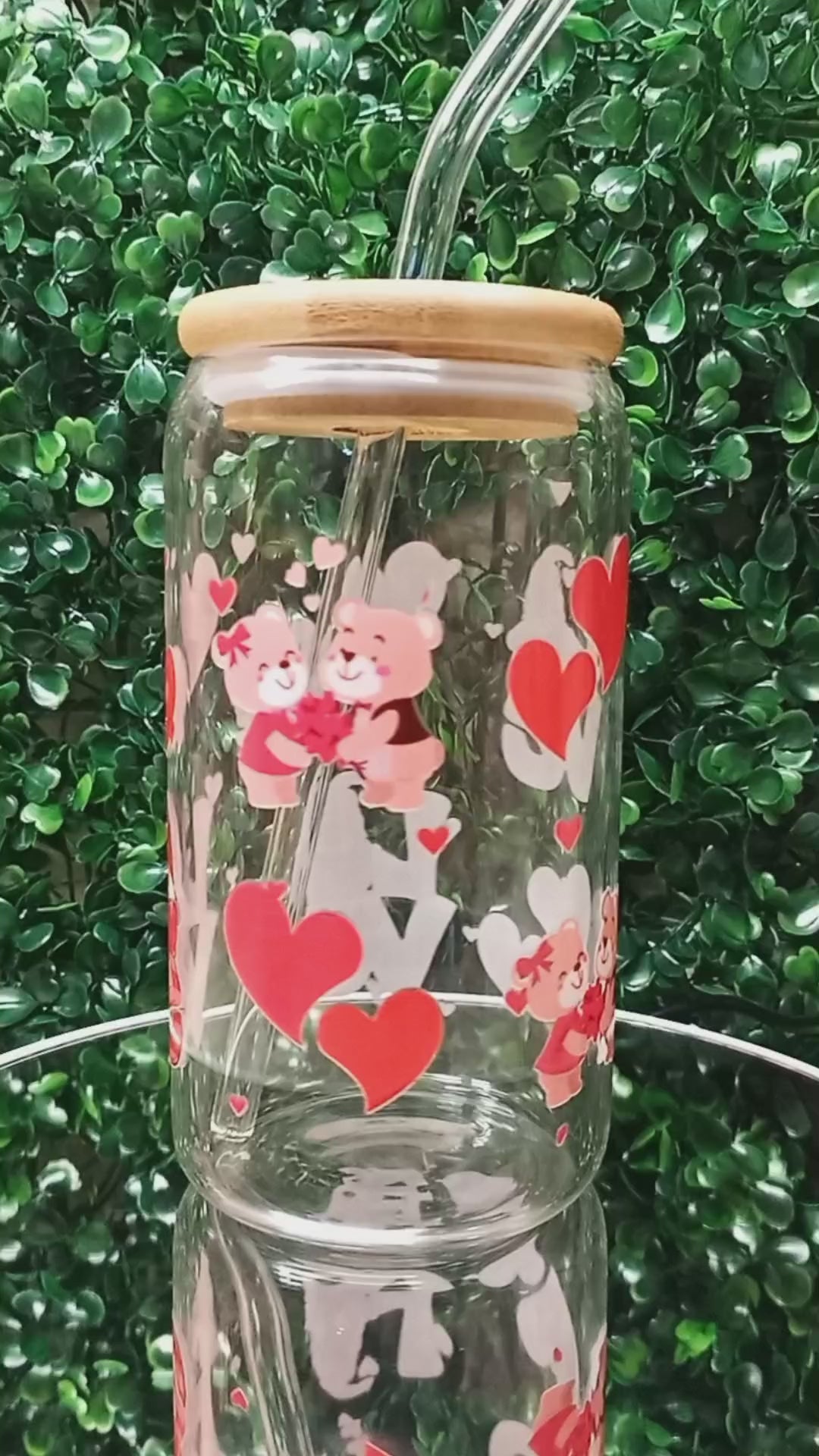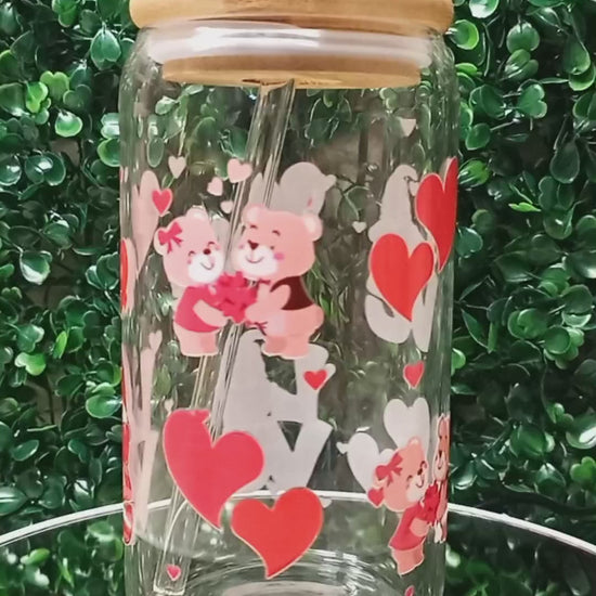 Love Heart Iced Coffee Glass cup with lid and Straw Personalized gift for Valentine's Day, Birthday, 16oz, 20oz Glass Tumbler