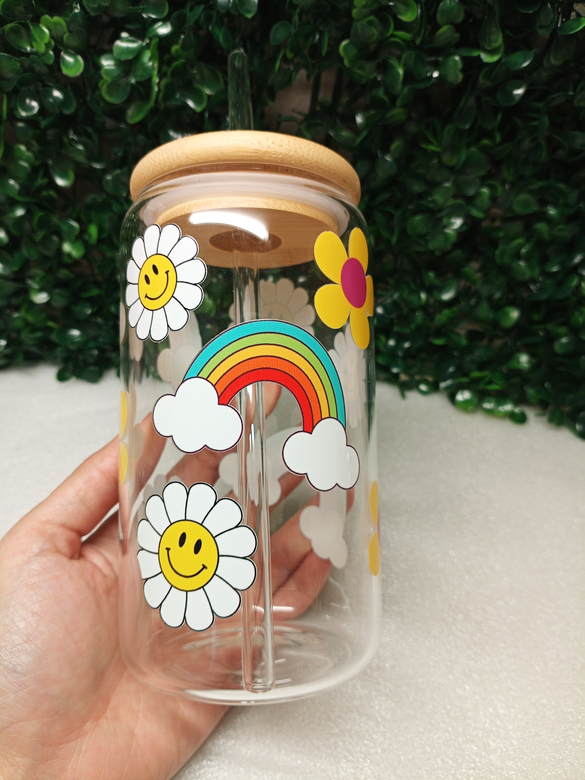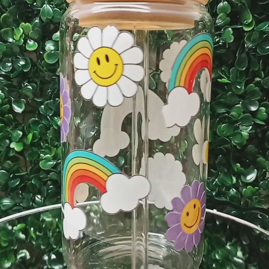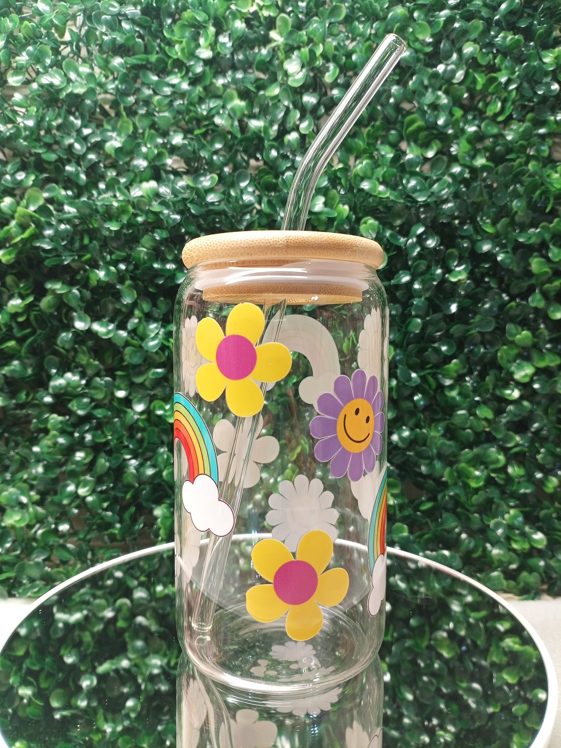Rainbow Garden Iced Coffee Glass cup with lid and Straw Personalized gift for Valentine's Day, Mother's Day, Birthday, 16oz, 20oz Glass Cup