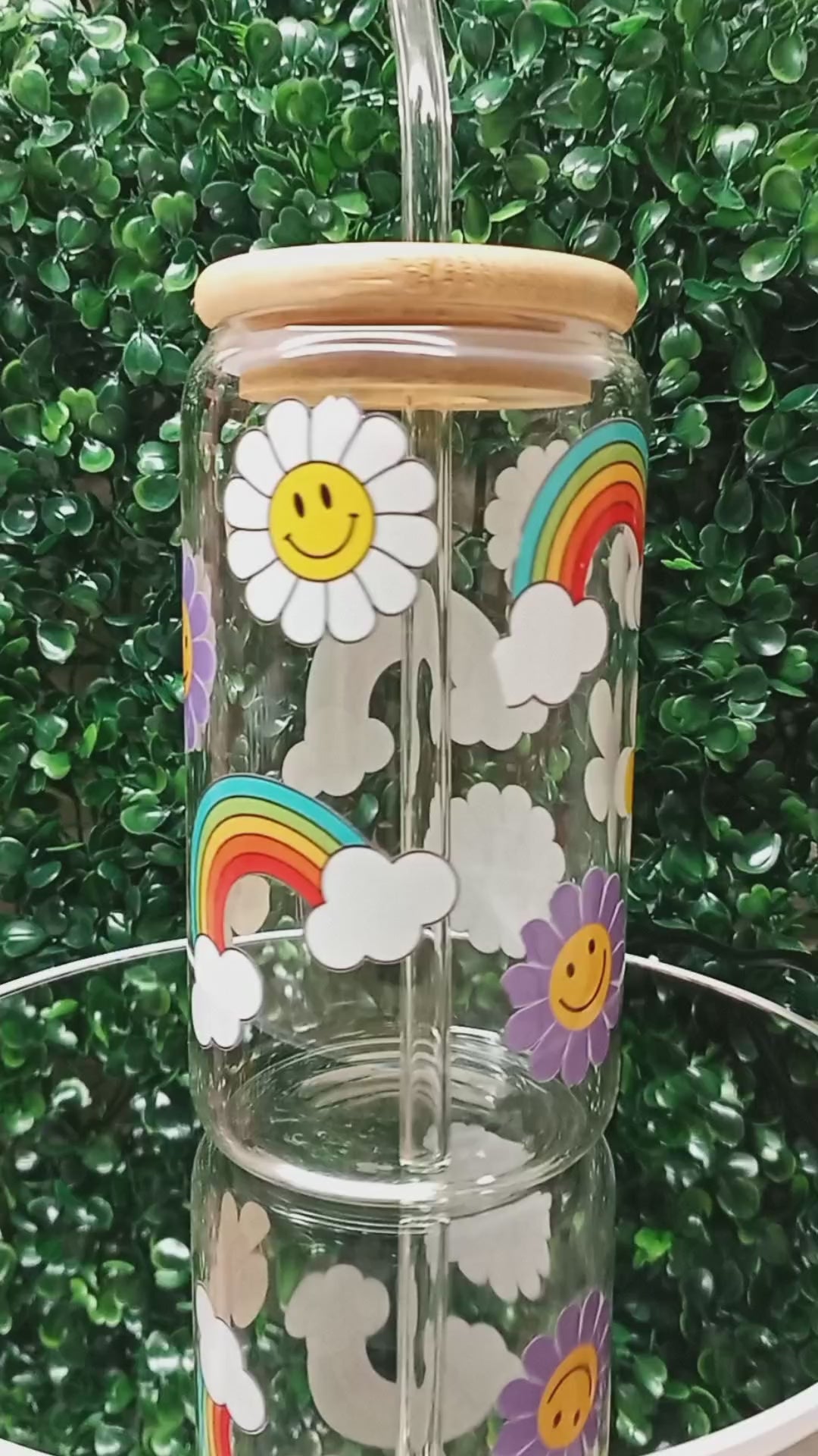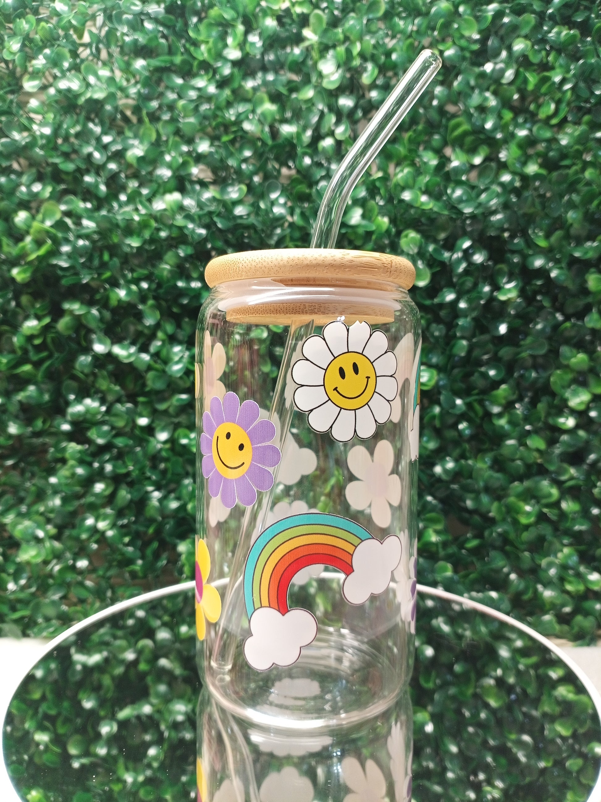 Clear Glass cup holds 16 oz, 20 oz of your favorite beverage, includes a bamboo lid and glass straw, this cute glass cup is the perfect way to enjoy your favorite beverage without sacrificing on style. Its modern and compact design makes it a great choice for on-the-go. The design is placed onto the glass using a high quality UVDTF transfer making it permanent, almost texture free, waterproof, and it's designed to withstand daily use and washing, making it an ideal choice for everyday use.