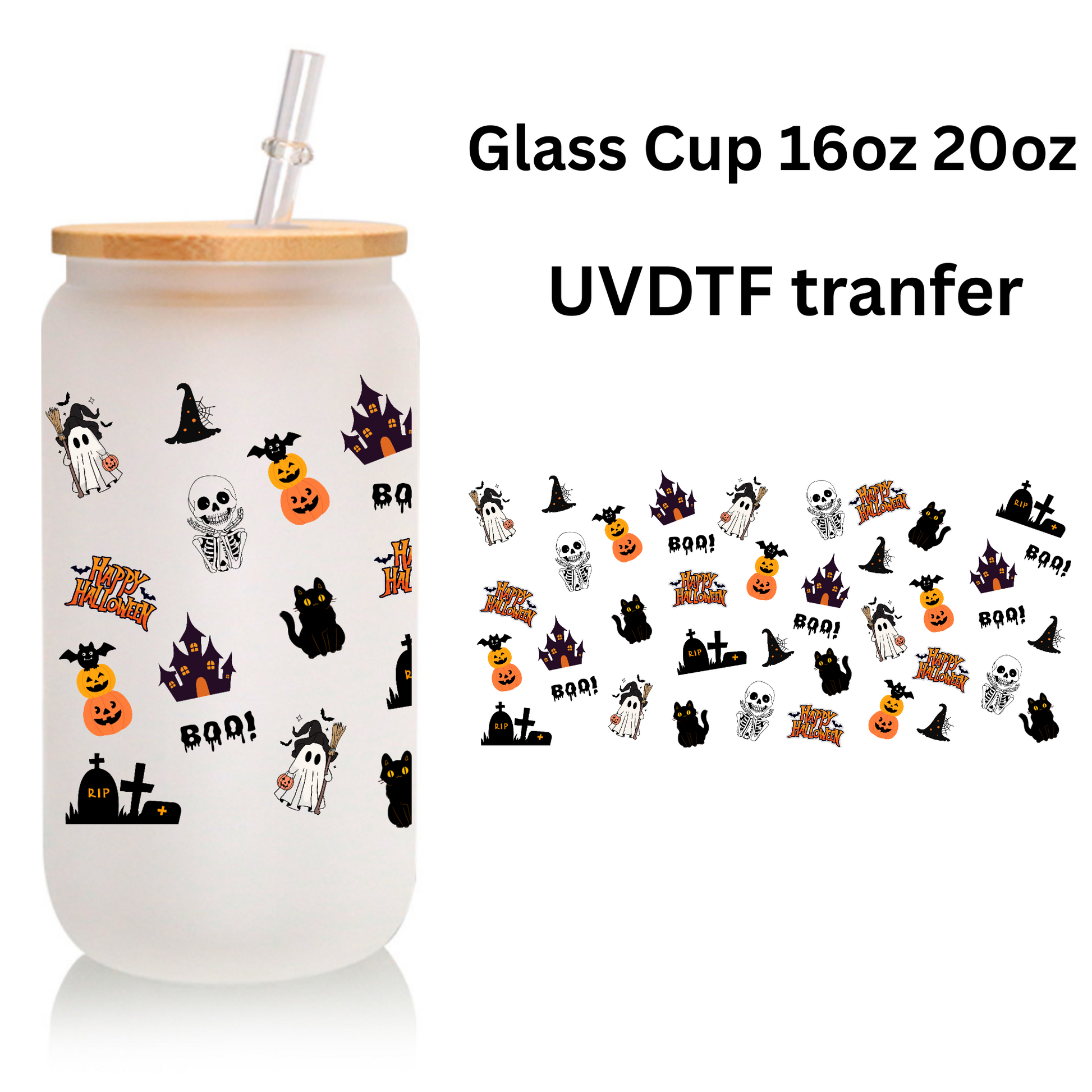 Keywords: Halloween cup set, frosted glass tumbler, pumpkin tumbler, skeleton cup, witches hat glass, reusable straw, bamboo lid, fall drinks, party cup