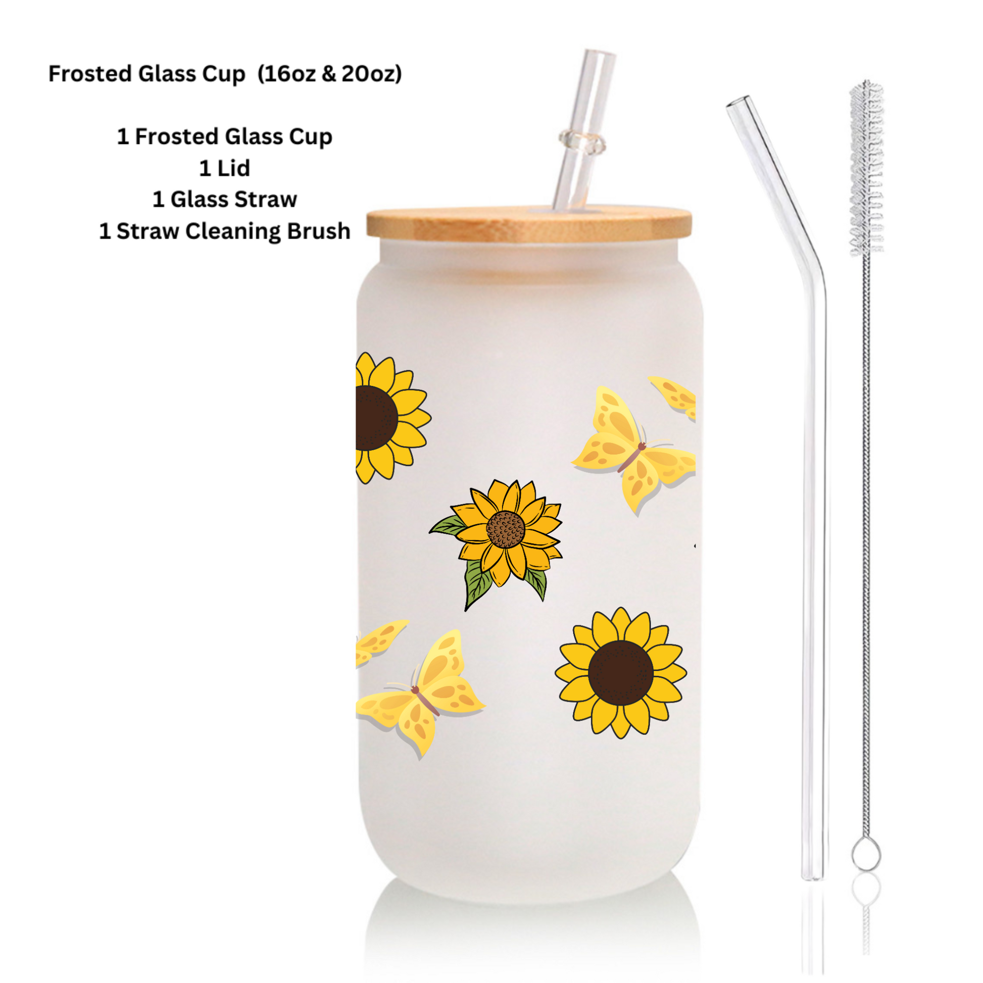 Sunflower & Butterfly Frosted Glass Can with Bamboo Lid and Straw β 16oz/20oz
