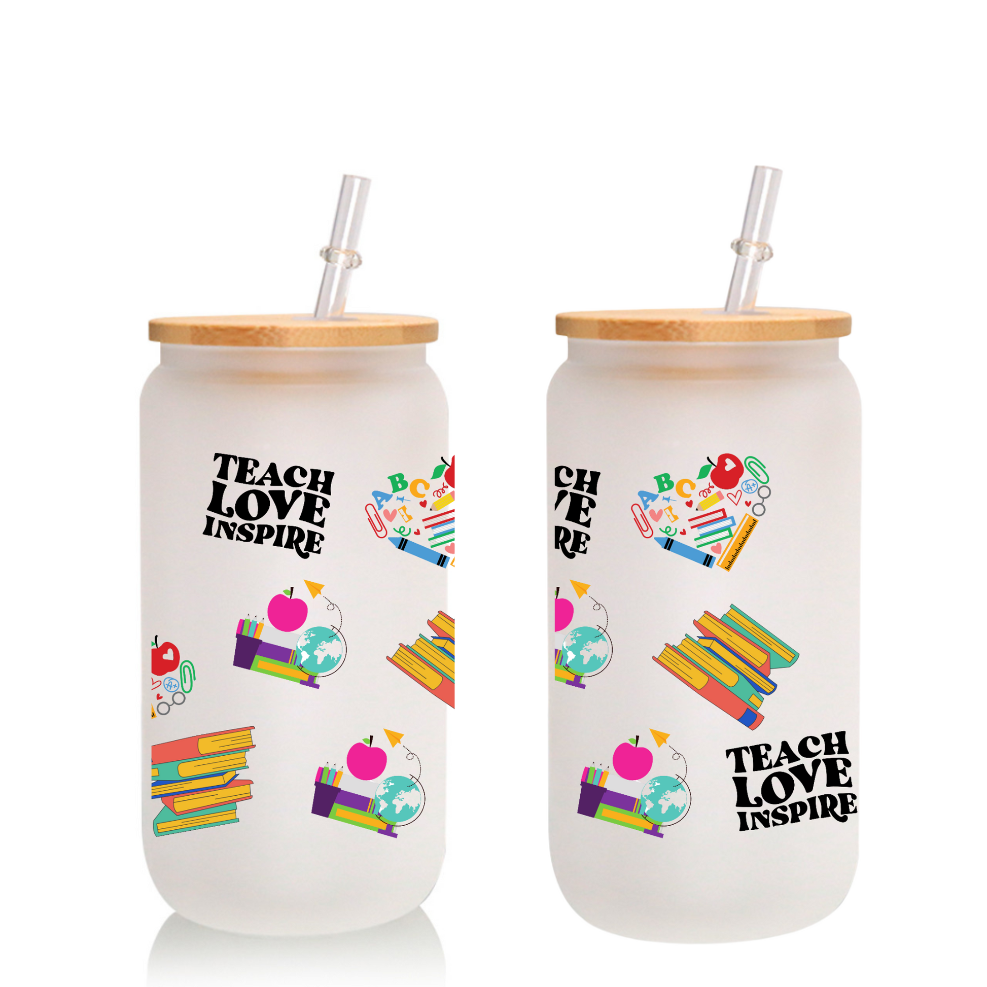 Teacher Love Inspire Frosted Glass Cup – 16oz / 20oz Tumbler with Glass Straw & Bamboo Lid – Personalized Gift for Teachers, Office, Home, or Party