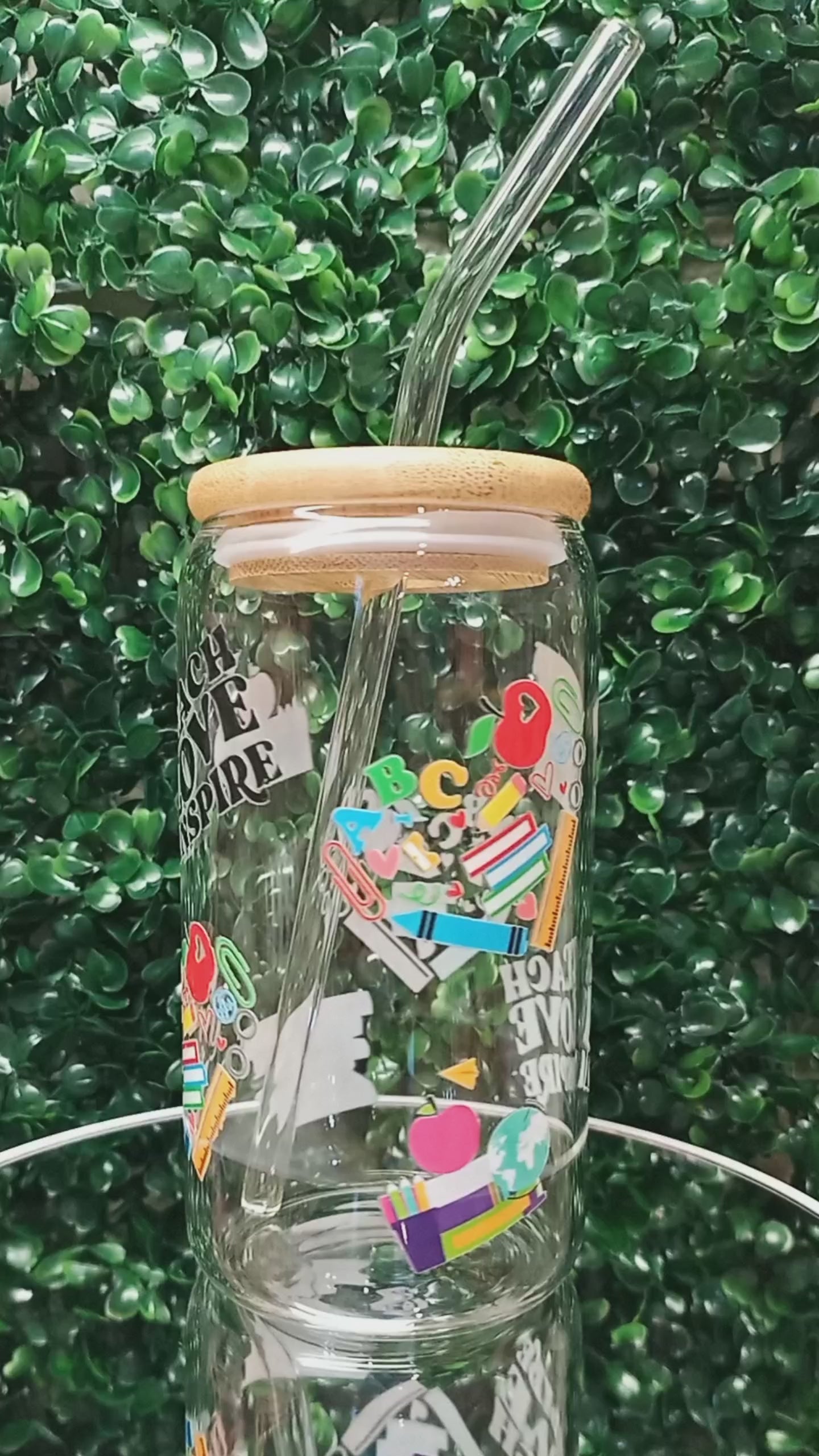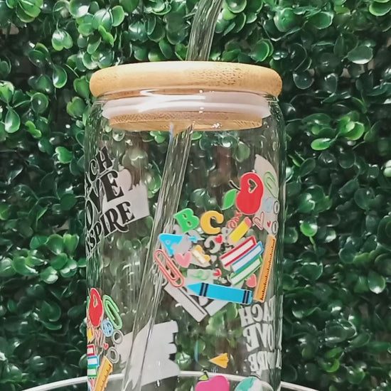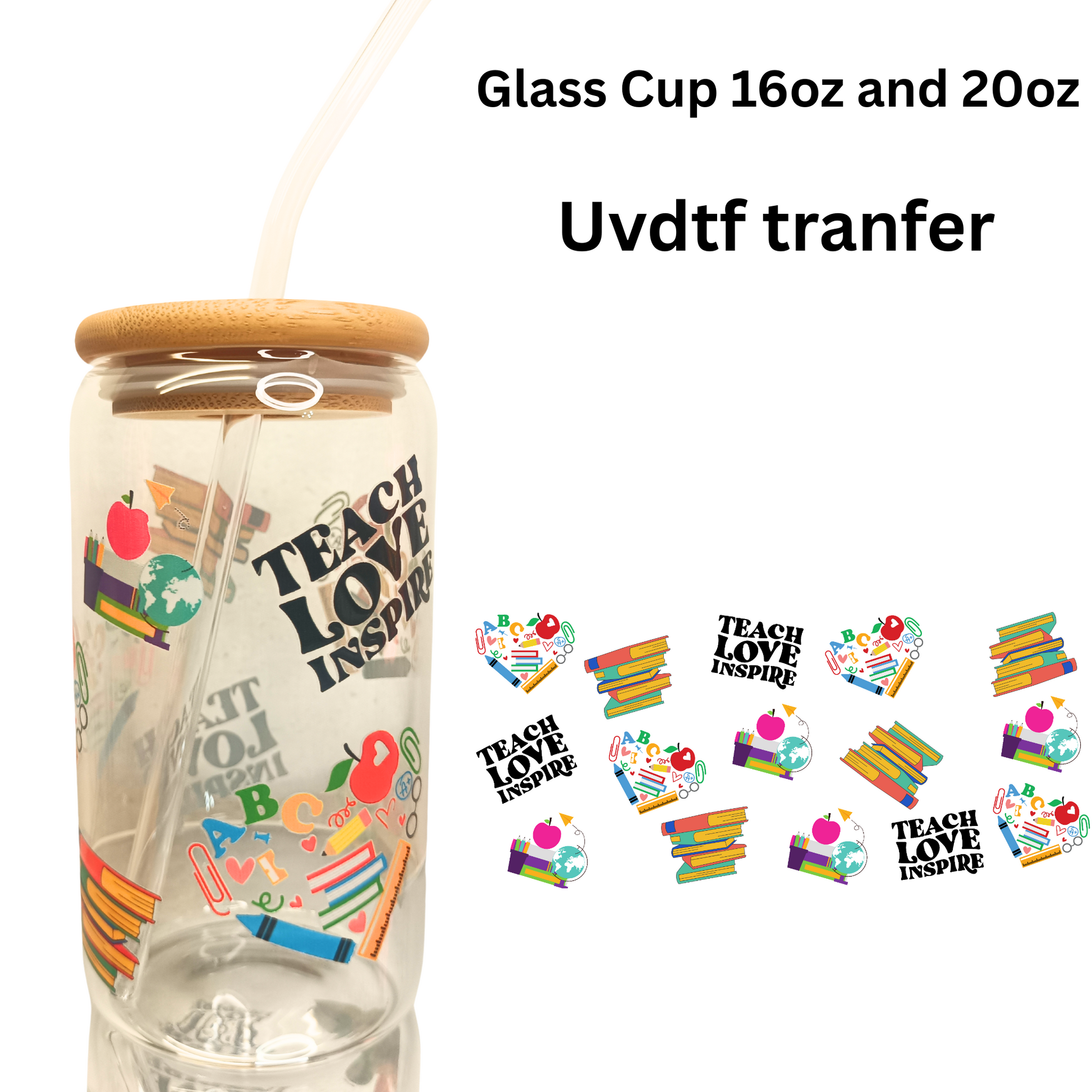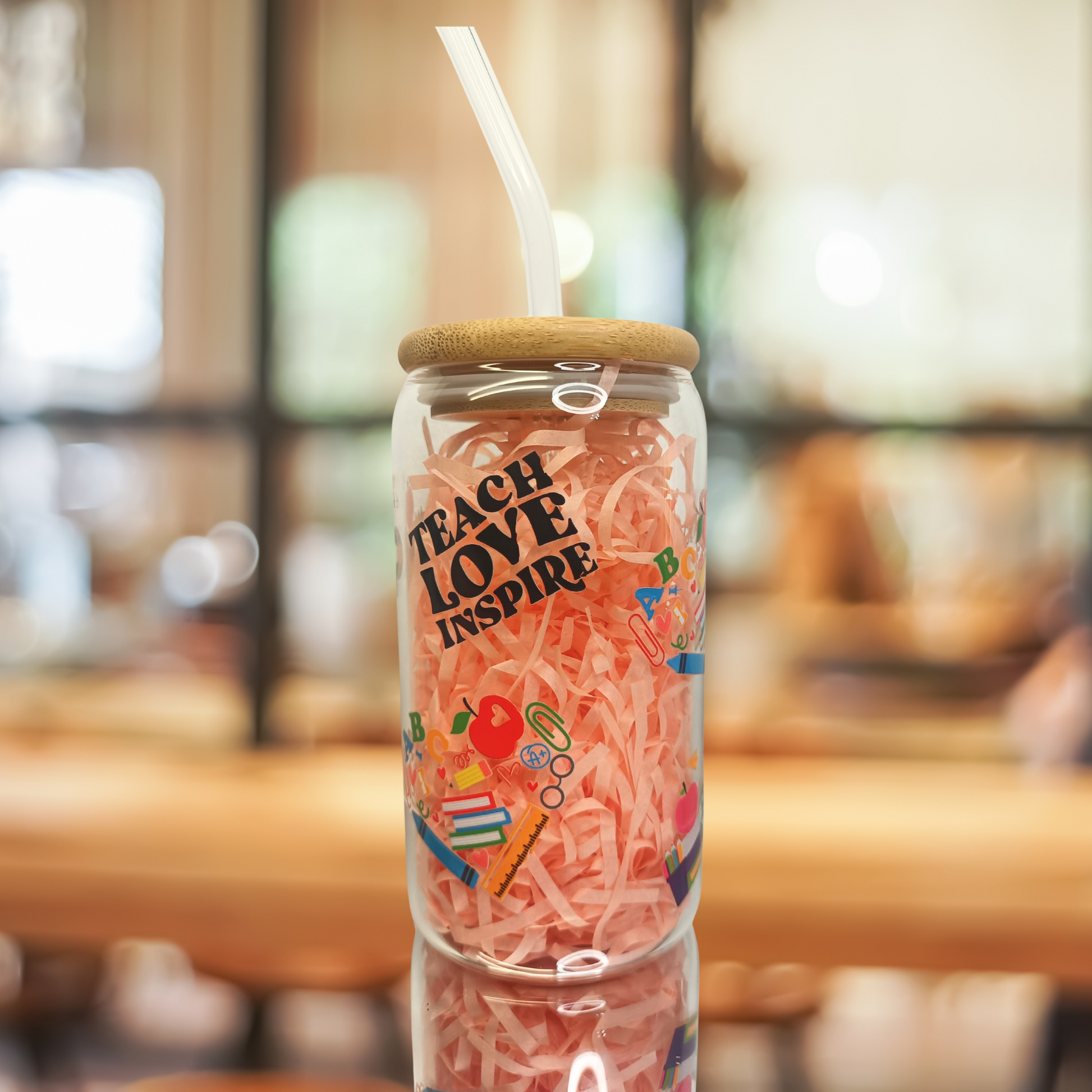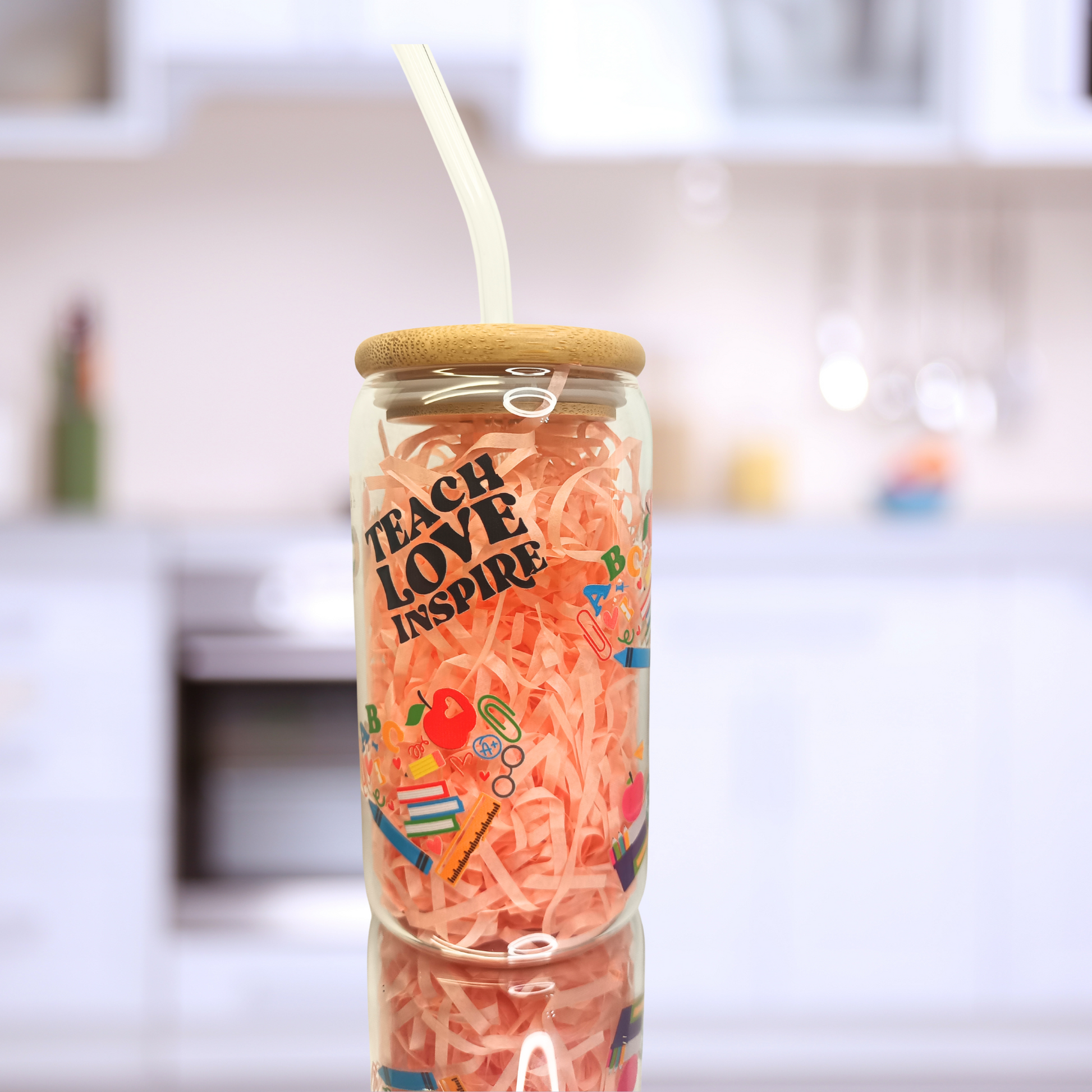 Teacher Love Inspire Glass Cup, Personalized Glass Cup 16oz & 20oz Tea, Coffee, Smoothie Glass, Perfect for gift,Home, Office, Party