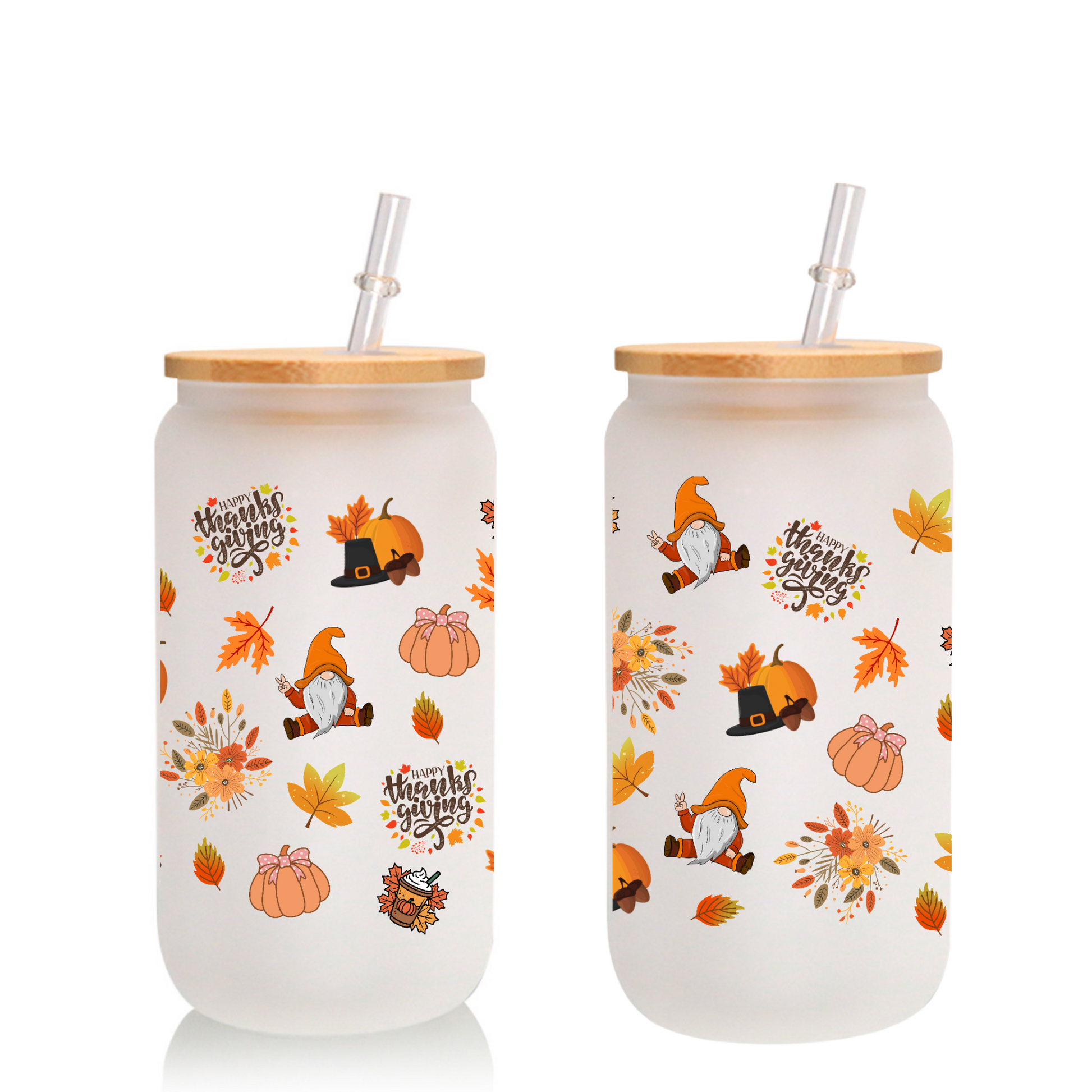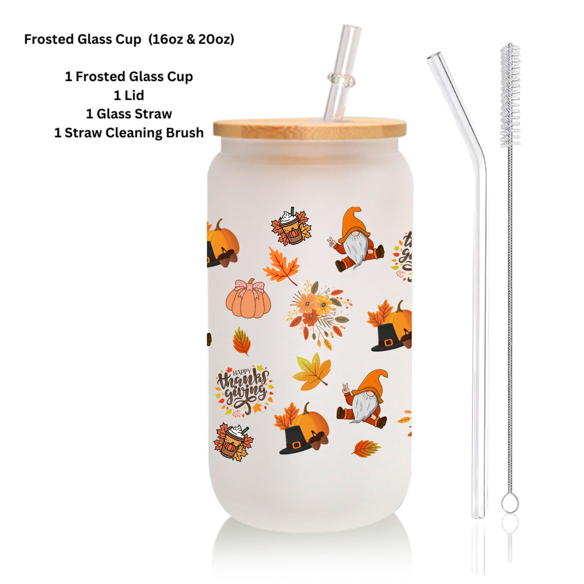 Thanksgiving Frosted Glass Cup 16oz/20oz – Clear Tumbler with Fall Leaves, Pumpkin & Hat Design, Bamboo Lid & Straw